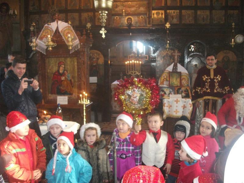 La sfirsitul slujbei cei mai mici enoriasi ai nostri, copiii de la gradinita satului, indrumati de doamna preoteasa au organizat o serbare traditionala, inaintea lui mos Craciun si a parintilor si bunicilor. Cu emotia virstei, dar si cu mult entuziasm au cintat colinde, au recitat poezii si au prezentat si alte obiceiuri crestinesti specifice acestor sfinte sarbatori.